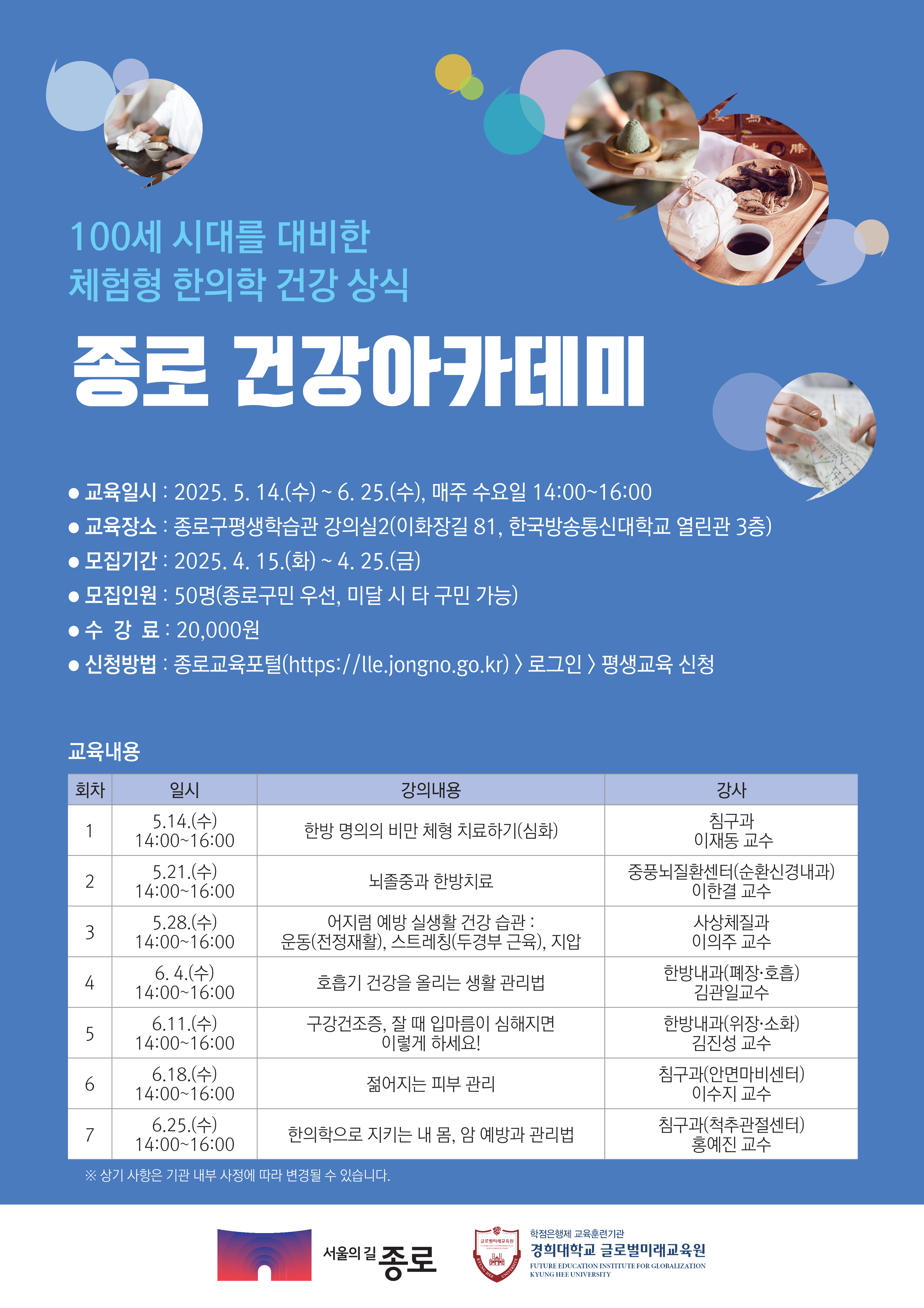 종로구에서 ‘경희대학교와 함께하는 종로 건강 아카데미’ 수강생을 모집합니다.